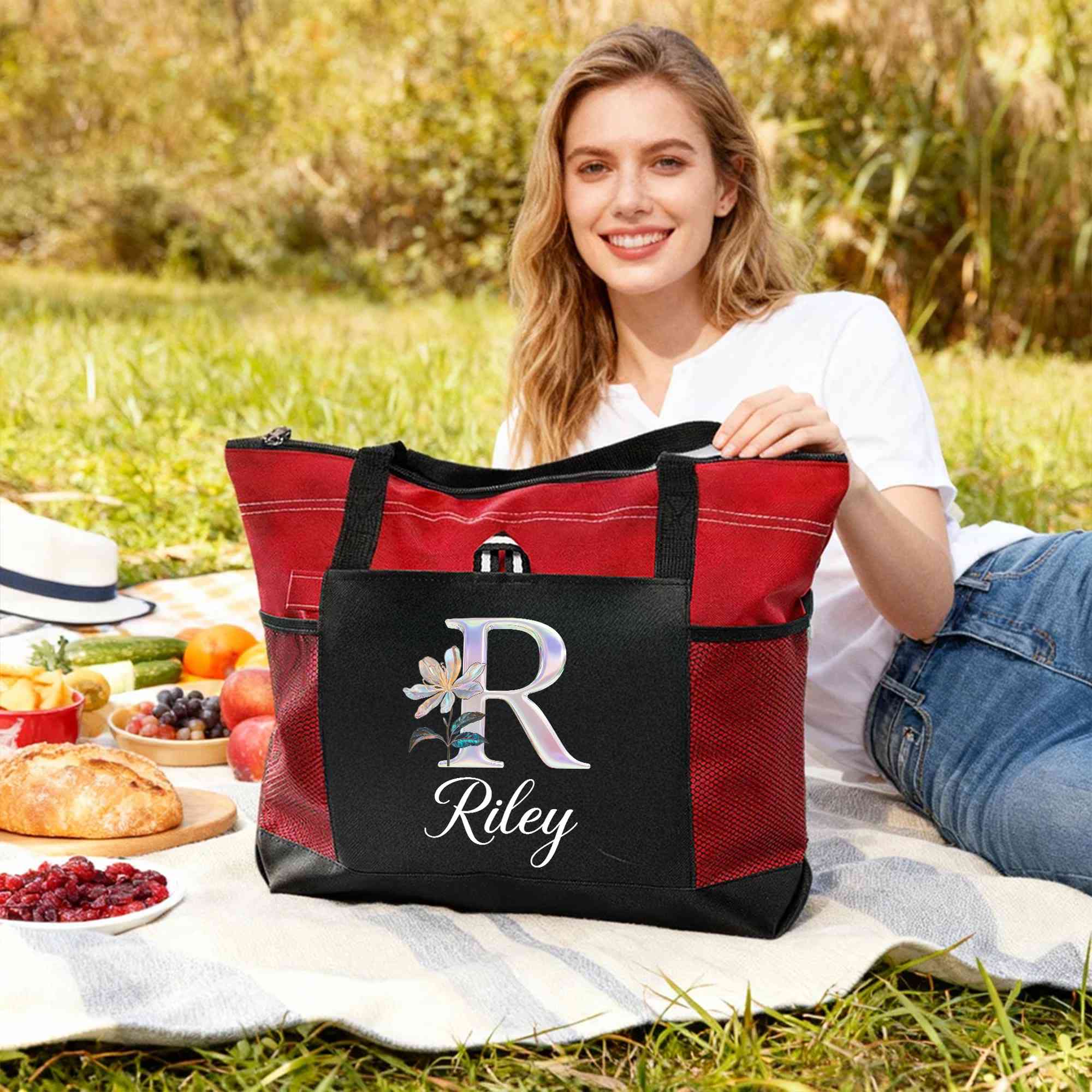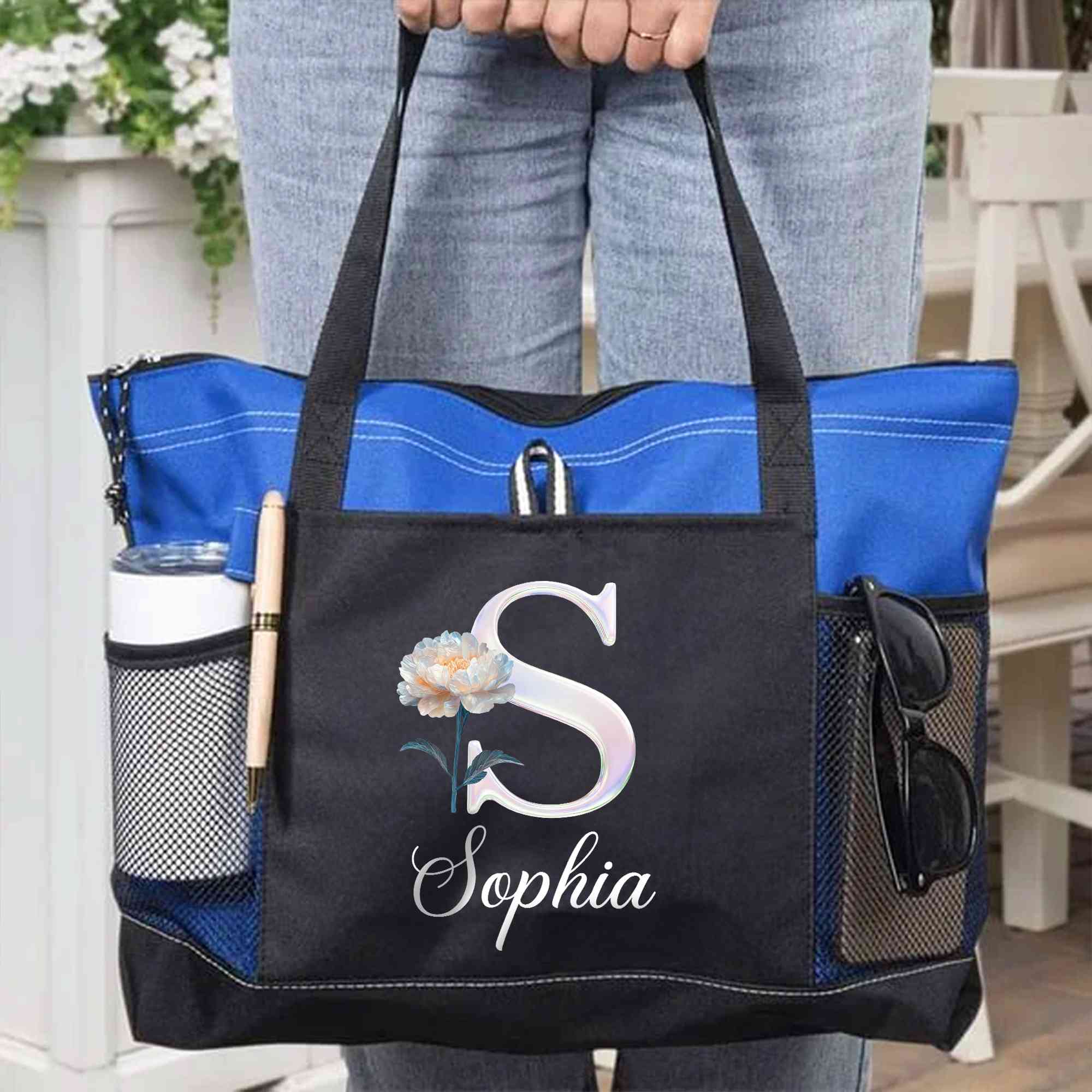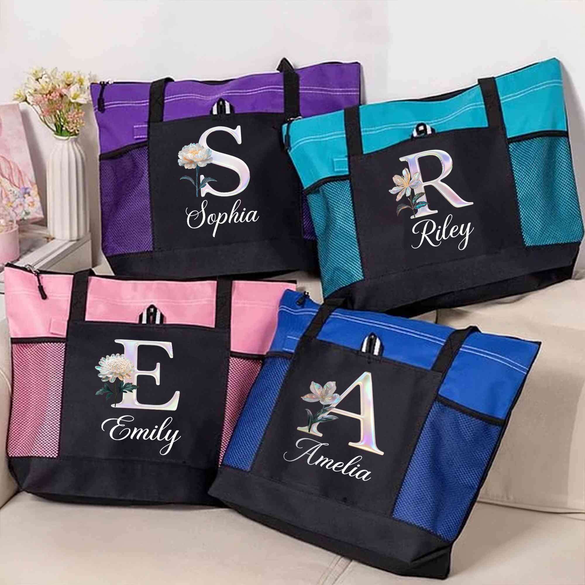 Personalized Name Mother of Pearl Initial Birth Flower Tote Bag, Large Capacity Oxford Cloth Handbag with Mesh Pockets, Gift for Her/Mom/Women