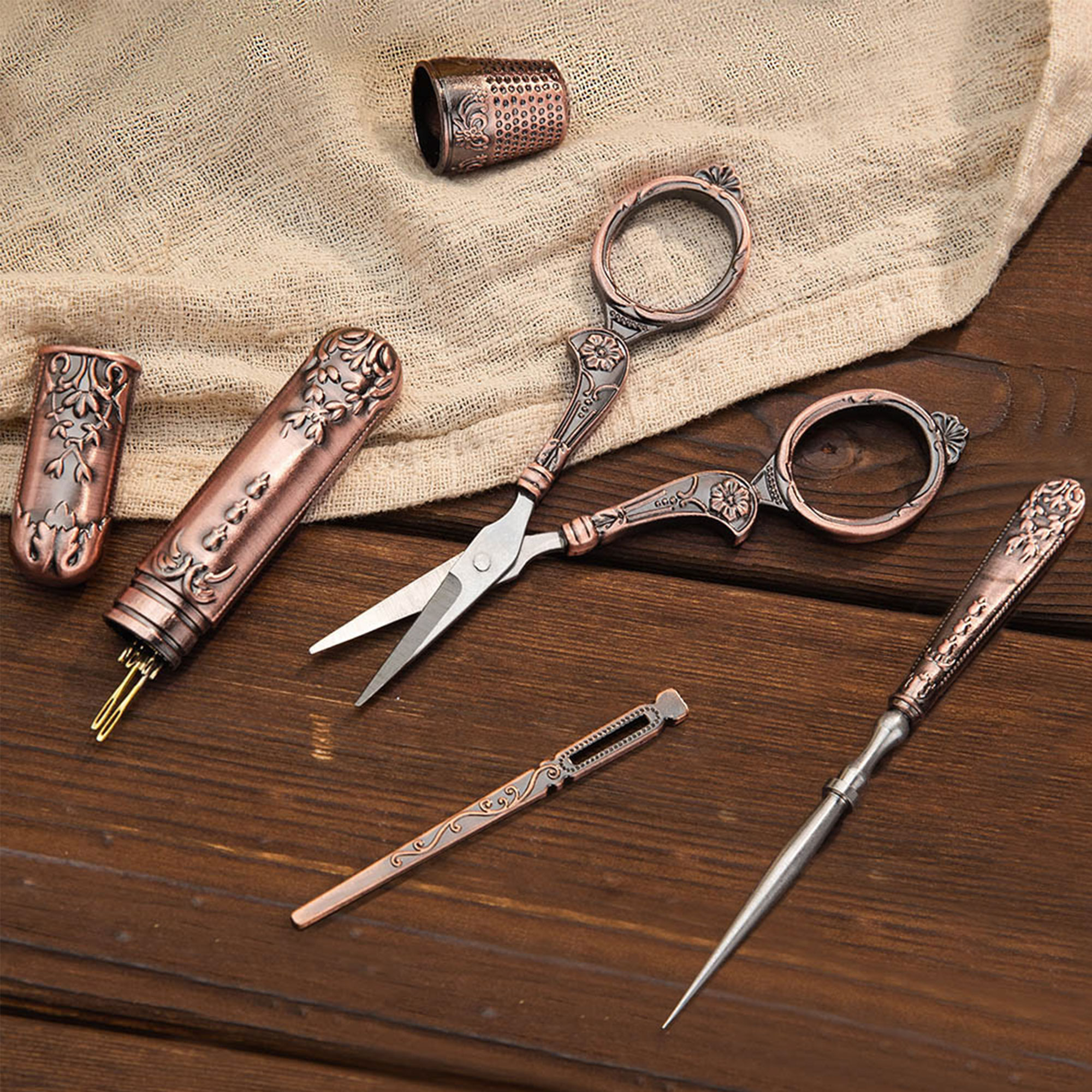 Practical Sewing Tools - This compact set includes six essential sewing items: scissors, needle threader, thimble, needle box, awl, and 16 sewing needles. The vintage-style scissors feature both a graceful look and sharp, long-lasting blades that handle embroidery, cross-stitch, beading, and other detailed craft work with ease. Their precise, pointed tips help you trim tight corners or delicate areas, perfect for creative sewing, needlepoint, or any fine handmade project.